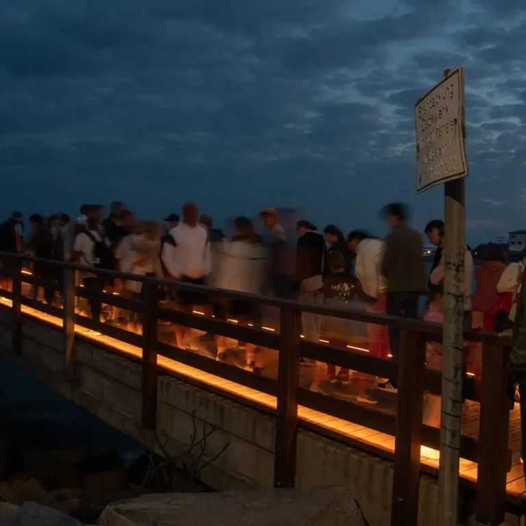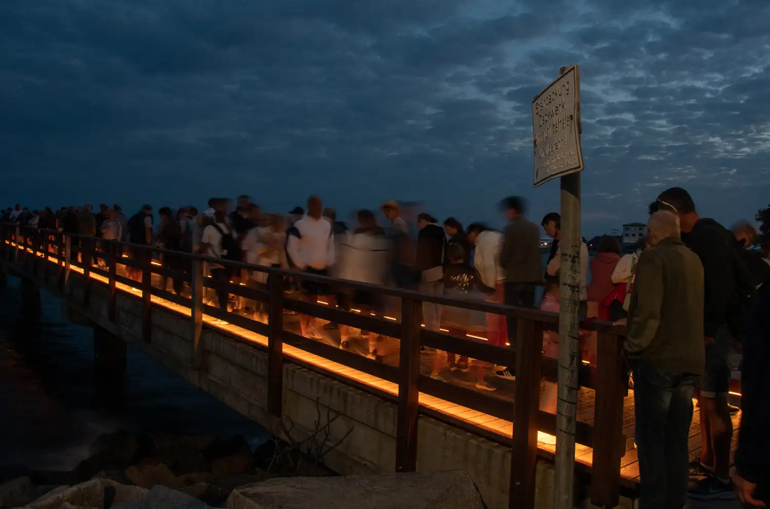 Ein Jongleur bringt mit kleinen Kunststücken Bewegung ins Geschehen – und begleitet bei gutem Wetter den Mondaufgang um 21:11 Uhr mit einer Feuershow. Dieser besondere Moment wird unten am Ufer der Ostsee gemeinsam begrüßt – ruhig, atmosphärisch und offen für alle, die kurz innehalten möchten.
